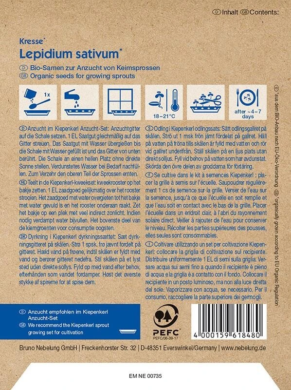 Als Würzmittel ist Kresse seit Jahrhunderten bekannt. Sie ist der Klassiker unter den frischen Sprossen. Kresse-Sprossen schmecken scharf-würzig und passen hervorragend zu Salaten, Quarkspeisen, Suppen oder einfach als Brotbelag. 2- bis 3-Mal täglich bis zur Ernte spülen. Verzehrfertig in 5 bis 10 Tagen.