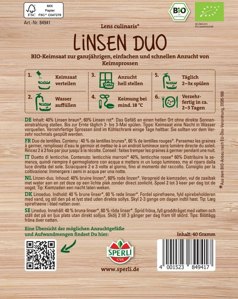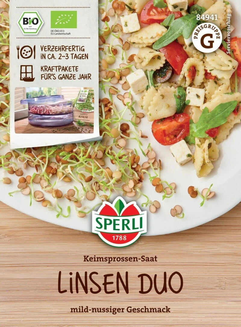 Das ‚Linsen-Duo‘, bestehend aus 40% braunen Linsen* und 60% roten Linsen*, begeistert mit einem mild-nussigen Geschmack. Wir empfehlen Dir die Kultur in der SPERLI Sprossenbox. Bereits nach 2-3 Tagen sind die Keimsprossen erntereif.