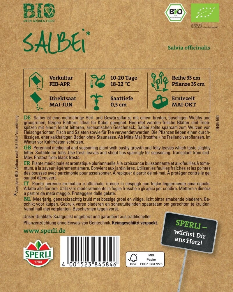 Der BIO-Salbei von SPERLI ist eine mehrjährige Heil- und Gewürzpflanze mit einem breiten, buschigen Wuchs und graugrünen, filzigen Blättern. Er ist ideal für die Kultur im Kübel geeignet. Geerntet werden im Zeitraum von Mai bis Oktober die frischen Blätter und Triebspitzen mit einem leicht bitteren, aromatischen Geschmack. Salbei sollte sparsam zum Würzen von Fleischgerichten, Fisch und Salaten sowie für Tee verwendet werden. Die Pflanzen lieben einen durchlässigen, eher kalkhaltigen Boden ohne Staunässe. Ab Mitte Mai können vorgezogene Jungpflanzen ins Freiland verpflanzt werden, sofern dieses sicher frostfrei ist. Im Winter muss der mehrjährige Salbei vor Kahlfrösten geschützt werden.