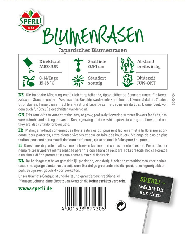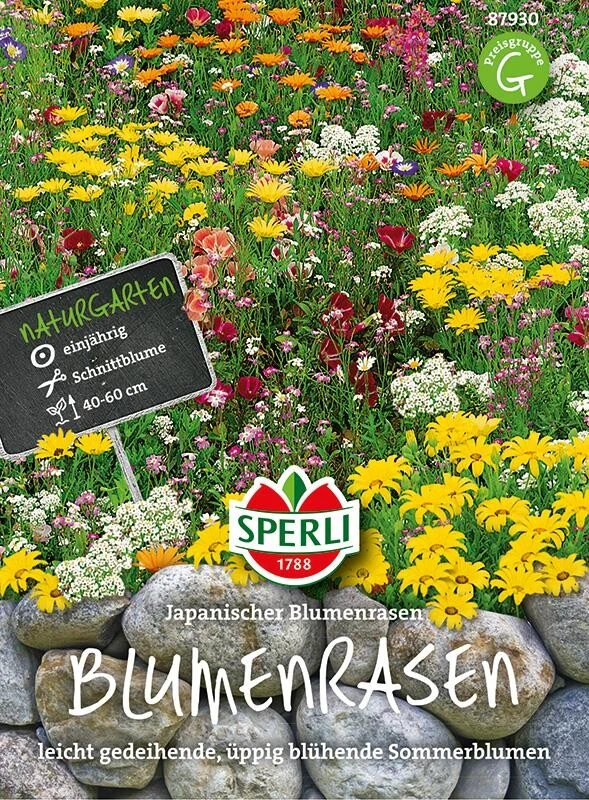 Die Blumenmischung „Japanischer Blumenrasen“ ist eine beliebte Mischung niedriger Sommerblumen, die bereits zu Großmutters Zeiten die Gärten bunt machte. Zudem bietet sie den ganzen Sommer lang Gelegenheit, Blumen für die Vase zu schneiden. Aber auch die Tierwelt kommt dabei zu nicht zu kurz, denn zahllose Schmetterlinge, Bienen, Hummeln und Nützlinge finden auf den Blüten Nektar und Pollen. Die Mischung enthält Bauerngartenblumen wie Zinnien, Clarkien, Zwergmargeriten, Sommerastern, Ringelblumen, Schleifenblumen, Duftsteinrich, Schleierkraut und viele andere mehr.