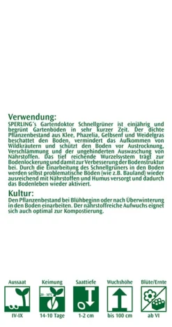 SPERLI’s Schnellgrüner ist einjährig und begrünt Gartenböden in kurzer Zeit. Der dichte Pflanzenbestand aus Klee, Phazelia, Gelbsenf und Weidelgras beschattet den Boden, vermindert das Aufkommen von Wildkräutern und schützt den Boden vor Austrocknung, Verschlämmung und der ungehinderten Auswaschung von Nährstoffen. Das tief reichende Wurzelsystem trägt zur Bodenlockerung und damit zur Verbesserung der Bodenstruktur bei. Durch die Einarbeitung des Schnellgrüners in den Boden werden selbst problematische Böden (wie z.B. Bauland) wieder ausreichend mit Nährstoffen und Humus versorgt und dadurch das Bodenleben wieder aktiviert. Der nährstoffreiche Aufwuchs eignet sich auch optimal zur Kompostierung.