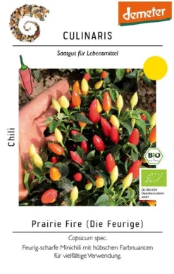 Die breit-buschige Prairie Fire ist regelrecht übersät mit kleinen, aufrecht stehenden, feurig scharfen Chilischoten, die von matt gelb nach dunkelrot abreifen. Sie eignet sich sowohl zum Rohverzehr, zum Kochen als auch zum Einlegen. Sie ist hübsch und produktiv im Beet und im Topf. Die Sorte eignet sich sehr gut für den Freilandanbau, kann aber auch geschützt angebaut werden. Prairie Fire wurde in einer zweijährigen Sichtung aus über 50 Capsicum-Sorten auf ihre Eignung für die Kultivierung unter Low-Input-Bedingungen in Töpfen und im Freiland getestet.