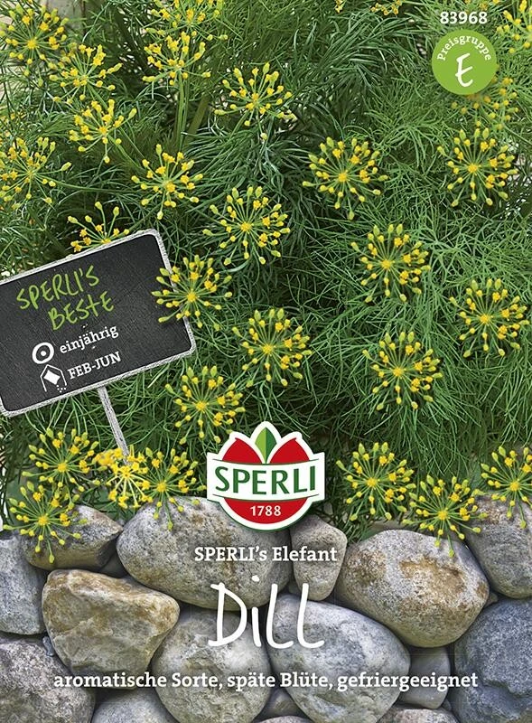 Der Dill ‚SPERLI’s Elefant‘ ist eine blattreiche Sorte mit hohem Krautertrag und Aromagehalt. Er ist insbesondere für die Freilandaussaat von April bis August geeignet und ideal für eine lange Ernte von Juni bis September, da die Blüte erst spät beginnt. Alternativ kann ‚SPERLI’s Elefant‘ im Gewächshaus von Februar bis Juni ausgesät und von April bis Dezember geerntet werden. Lockere, durchlässige und humose Erde ist im Freiland wie im Gewächshaus für eine erfolgreiche Kultur der schnellwüchsigen Pflanzen wichtig. In der Küche wird Dill frisch, getrocknet oder tiefgefroren zum Würzen von Essig, Salaten, Soßen und Fisch verwendet. Unentbehrlich ist er auch zum Einlegen von Gurken, wofür die Blütenkrone genutzt wird. Die Blätter können geerntet werden, sobald der Dill 20 bis 30 cm hoch ist.