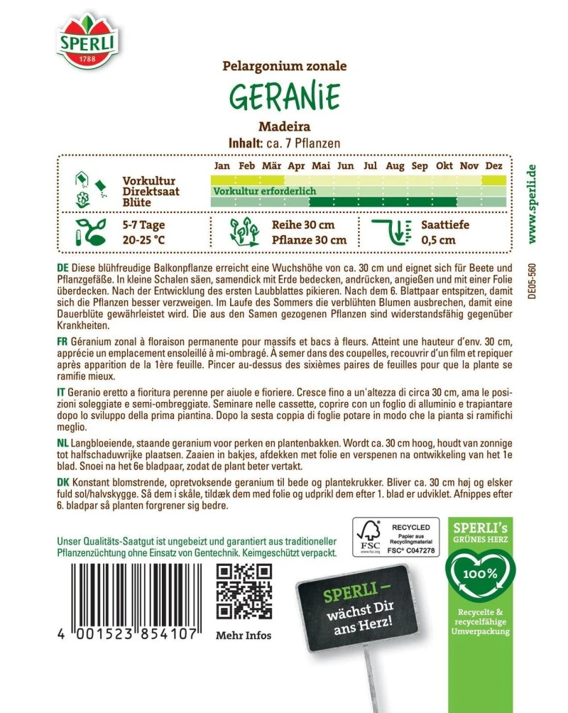 Bei der Geranie ‚Madeira‘ handelt es sich um eine blühfreudige Balkonpflanze für Beete, Rabatten, Kübel und viele andere Gefäße. Sie erreicht eine Wuchshöhe von ca. 30 cm und bildet leuchtend rote Blüten von Mai bis Oktober. Damit die Pflanzen so ausdauernd blühen können, ist es wichtig, die verblühten Blumen auszubrechen. ‚Madeira‘ liebt nährstoffreiche, durchlässige Böden in sonniger, teilweise auch halbschattiger Lage. Von Dezember bis März wird das Saatgut in kleine Schalen ausgebracht, samendick mit Erde bedeckt und die Aussaat anschließend angedrückt, angegossen und mit einer Folie bis zum Auflaufen überdeckt. Nach der Entwicklung des ersten Laubblattes sollten die jungen Pflanzen pikiert und nach Entwicklung des 6. Blattpaars entspitzt werden, damit sie sich besser verzweigen. Tipp: Die aus Samen gezogenen Pflanzen sind widerstandsfähig gegenüber Krankheiten und eignen sich besser für die Beetbepflanzung als aus Stecklingen gezogene Pflanzen.