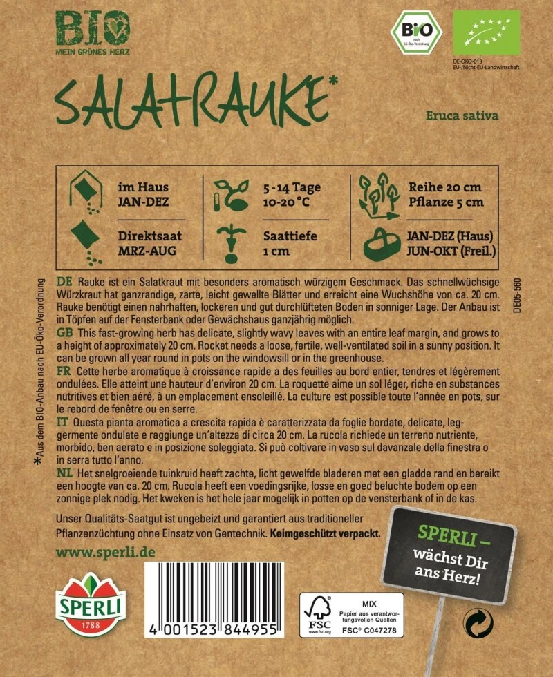 Ein mild-würziges Blattgemüse für gemischte Salate stellt die BIO-Salatrauke von SPERLI dar. Die ganzrandigen, leicht gewellten Blätter sind besonders zart und aromatisch und eignen sich auch wunderbar zum Garnieren. Im Haus können die Samen aus biologisch zertifizierter Anzucht ganzjährig angebaut und geerntet werden. Die Direktsaat ins Freie ist von März bis August möglich. Hier erstreckt sich die Ernteperiode von Juni bis Oktober. Am besten gedeiht die BIO-Salatrauke in einem nährstoffreichen, lockeren und gut durchlüfteten Boden an einem sonnigen Standort.