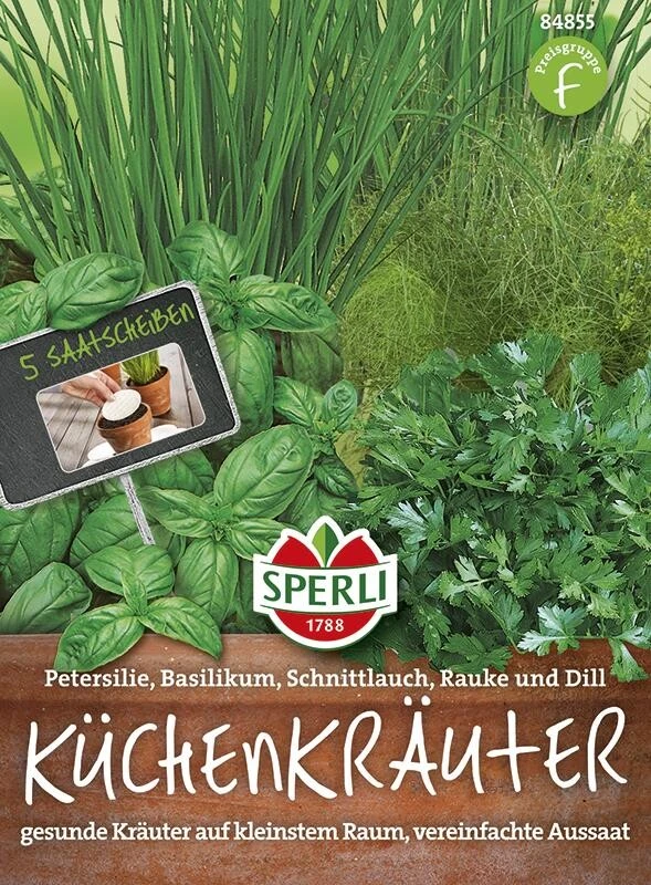 Mit SPERLI’s Küchenkräutern lassen sich gesunde, aromatische Kräuter auf kleinstem Raum denkbar einfach heranziehen. Samen für Petersilie, Basilikum, Schnittlauch, Rauke und Dill befinden sich auf Saatscheiben, die lediglich in passend große Töpfe gelegt werden müssen, die zu etwa drei Vierteln mit Anzuchterde gefüllt sein sollten. Die aufkommenden Pflanzen können später auch ins Freiland an einen sonnigen Standort versetzt werden. Hier bevorzugen sie lockere, durchlässige und humose Böden sowie regelmäßige Wassergaben. Für beispielsweise Pesto, Salate und Kräuterdips ist dieser Kräuter-Mix hervorragend geeignet.