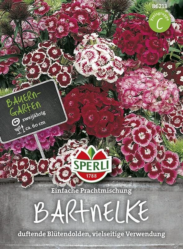 Diese zweijährige Mischung enthält Bartnelken mit großen, ungefüllten Blütendolden, die von Reinweiß über Rosa bis Schwarzrot reichen. Bestens geeignet für die Beetgestaltung, sommerliche Kübelkulturen oder als Schnittblumen.