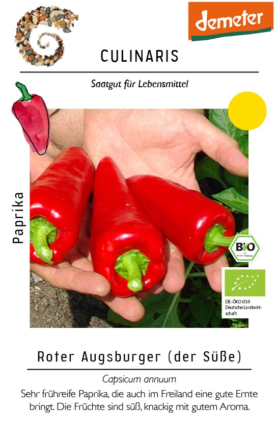 Der Paprika Roter Augsburger hat süße, spitze, leuchtend-rote Früchte. Er bereichert Salate und Gemüsepfannen, aber schmeckt besonders gut als Snack, zum Beispiel mit Frischkäse. Die Sorte eignet sich sehr gut für den Freilandanbau, kann aber auch geschützt angebaut werden. Sie ist sehr frühreif. Der Rote Augsburger wurde in einer zweijährigen Sichtung und in Zusammenarbeit mit ARCHE NOAH aus über 50 Capsicum-Sorten auf ihre Eignung für die Kultivierung unter Low-Input-Bedingungen in Töpfen und im Freiland getestet.