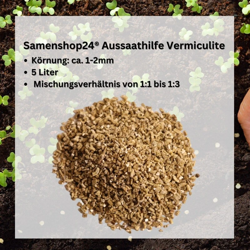 Die Saathilfe Vermiculite ist ein blättriges, schuppiges Schichtsilikat, das gelb-beige gefärbt ist. Es gehört zu den Tonmineralien, die maßgeblich zur Bodenfruchtbarkeit beitragen können. Das liegt an der Ionenaustauschfähigkeit des Vermiculits. Gerne wird es im Gartenbau für die Abdeckung von Aussaaten genutzt, da es die Fähigkeit besitzt Licht zu reflektieren und Feuchtigkeit zu speichern. Das schützt die Aussaat durch ausgeglichene Bodenfeuchtigkeit vor dem schnellen Austrocknen, dem Verschwämmen von Saatgut und sorgt für einen Schutz vor direkter Sonneneinstrahlung. Durch seine unebene, kantige, raue Oberfläche ist Vermiculite gut dafür geeignet es dem Saatgut, das man auf größeren Flächen ausbringen möchte, beizumischen. Neben den oben genannten Kulturvorteilen bringt es ebenfalls den Vorteil, dass der Ausbringende sieht, wo er bereits ausgesät hat und wo er noch säen muss.