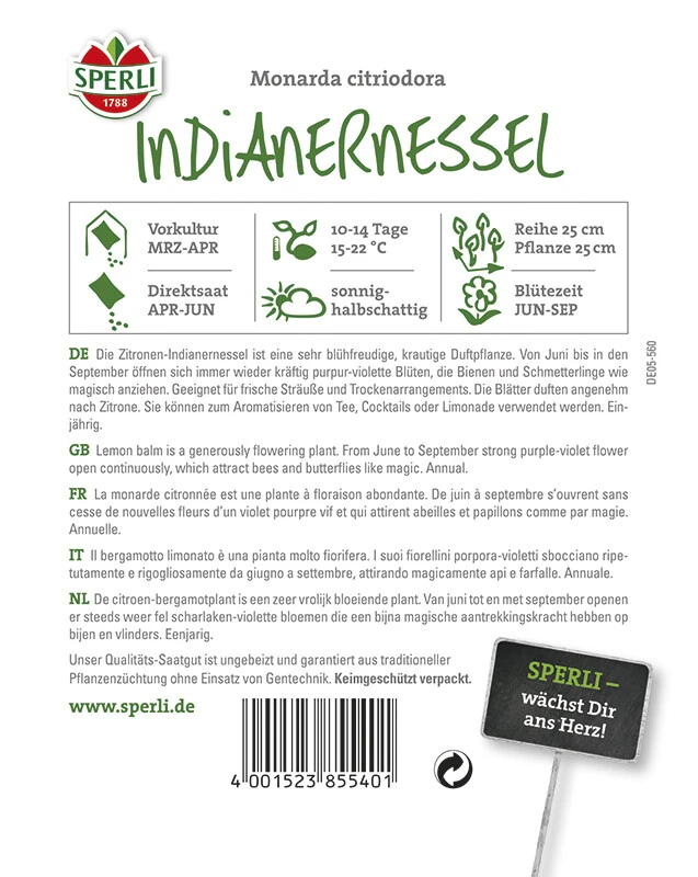 Die Indianernessel ist eine sehr blühfreudige Staude und ein echtes Paradies für Nützlinge wie Bienen, Hummeln und Schmetterlinge. Von Juni bis in den September öffnen sich immer wieder kräftig purpur-violette Blüten, die Bienen und Schmetterlinge magisch anziehen. Die einjährige Pflanze eignet sich für frische Sträuße und Trockenarrangements. Ihre Blätter duften angenehm nach Zitrone und können zum Aromatisieren von Tee, Cocktails oder Limonade verwendet werden.