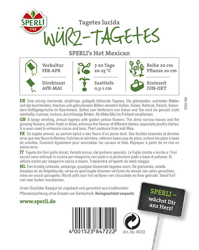 Die Würz-Tagetes ‚SPERLI’s Hot Mexican‘ ist eine würzig riechende, einjährige, goldgelb blühende Tagetes, auch bekannt als Studentenblume. Die glänzenden, schmalen Blätter und die leuchtenden, frischen und getrockneten Blüten veredeln Soßen, Salate, Rohkost, Fleisch und besonders Geflügelgerichte im Geschmack. Selbst zum Verfeinern von Kakao und Teegetränken wird diese Art von Tagetes genutzt. Die Pflanzen lieben nahrhafte, humose, lockere und durchlässige Böden. Werden sie nicht direkt ins Freiland ausgesät, können sie nach einer Vorkultur im Mai, wenn keine Fröste mehr drohen, in den Garten verpflanzt werden.